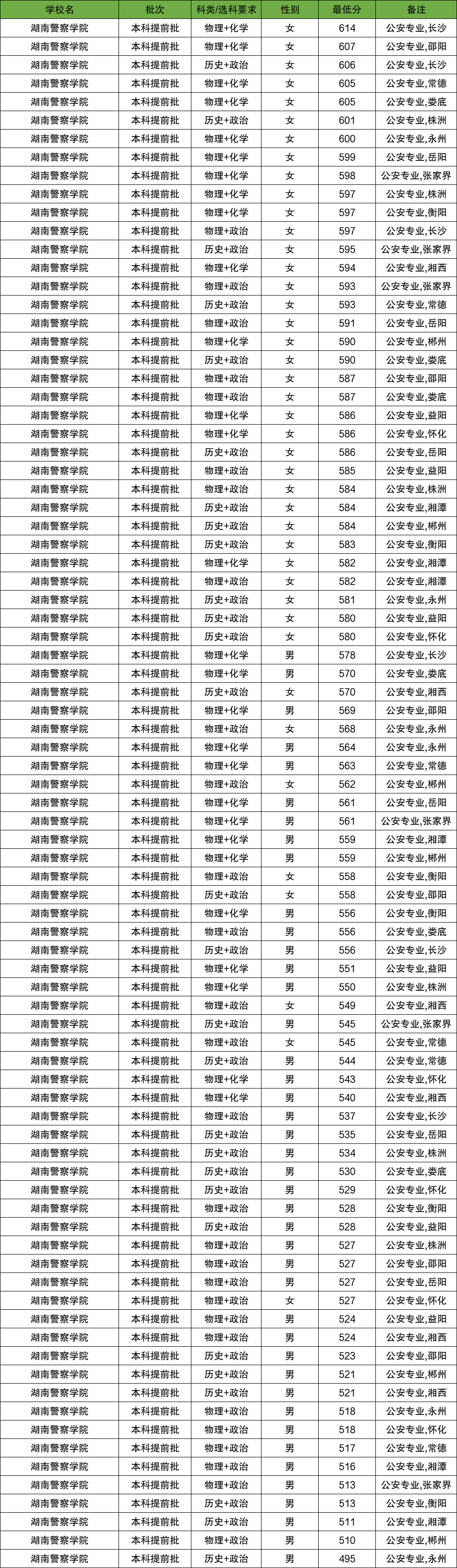 2025年湖南警校录取分数线如下:中国人民公安大学男生最低分596分,女生最低分615分;中国刑事警察学院男生最低分563分,女生最低分606分。