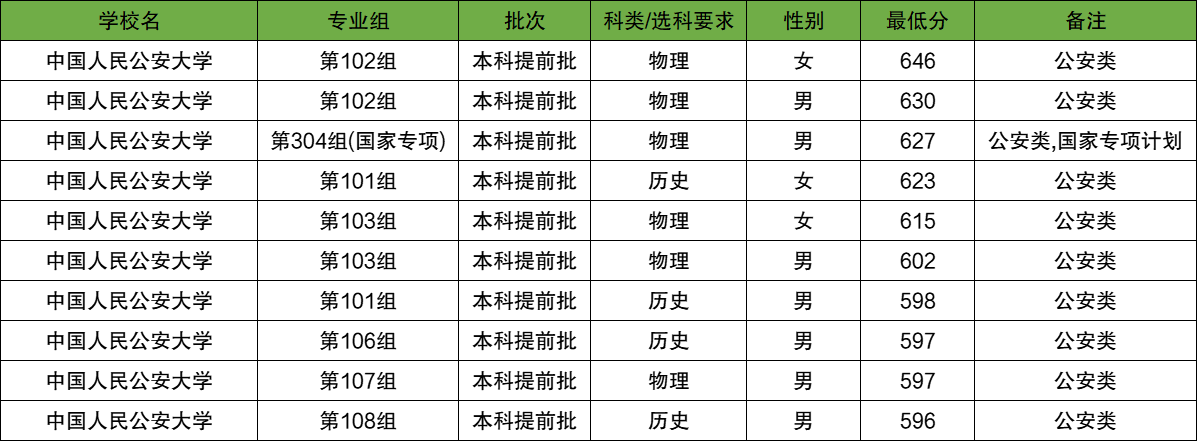 2025年该校公安类专业在湖南提前批招生分数中,女生分数最高的是第102组,2025年最低录取分为646分;女生分数最低的是第103组,2025年最低录取分为615分。