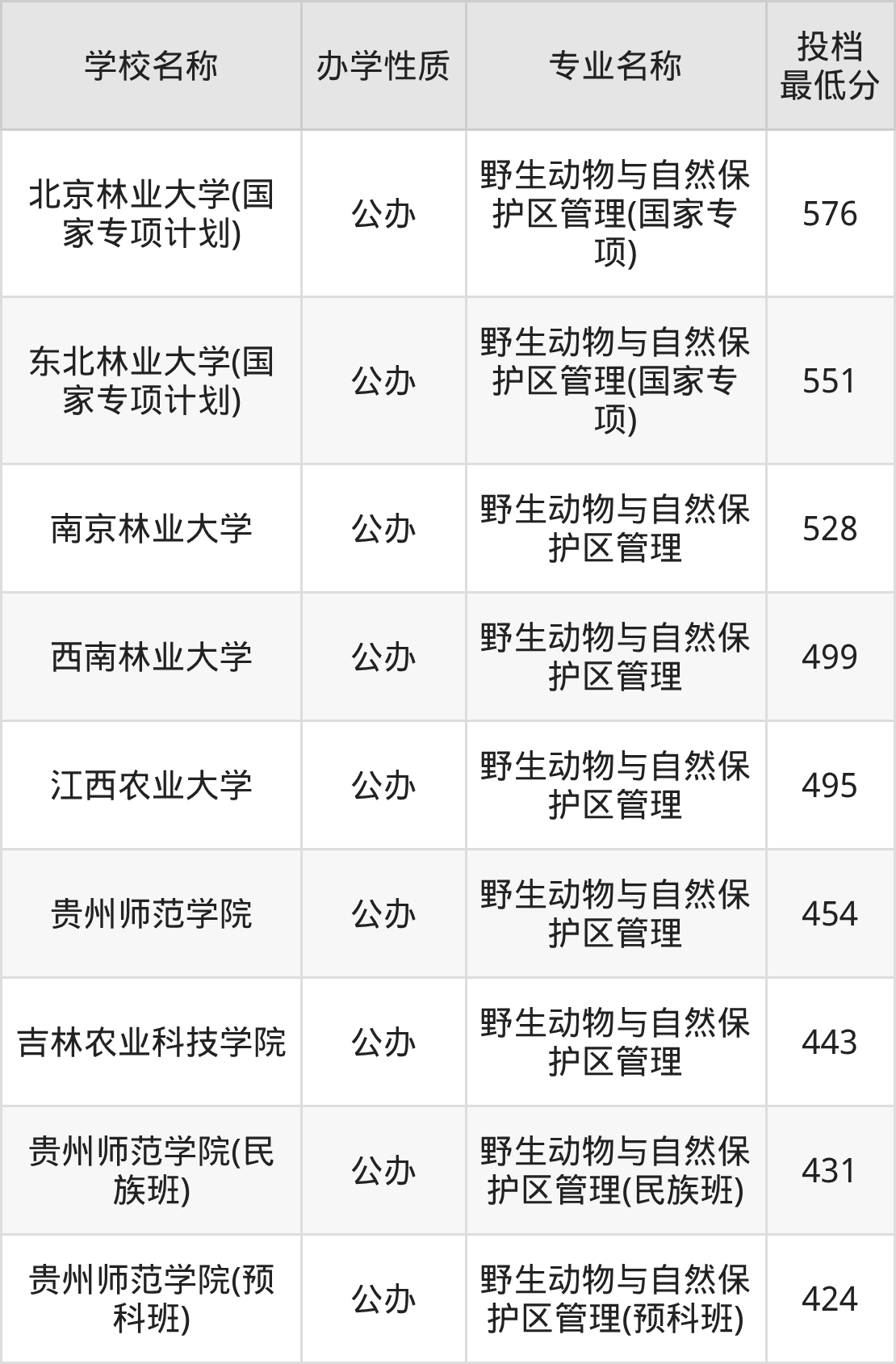 500分左右的野生动物与自然保护区管理大学:南京林业大学528分、东北林业大学(国家专项计划)551分(国家专项)、北京林业大学(国家专项计划)576分(国家专项)等;
