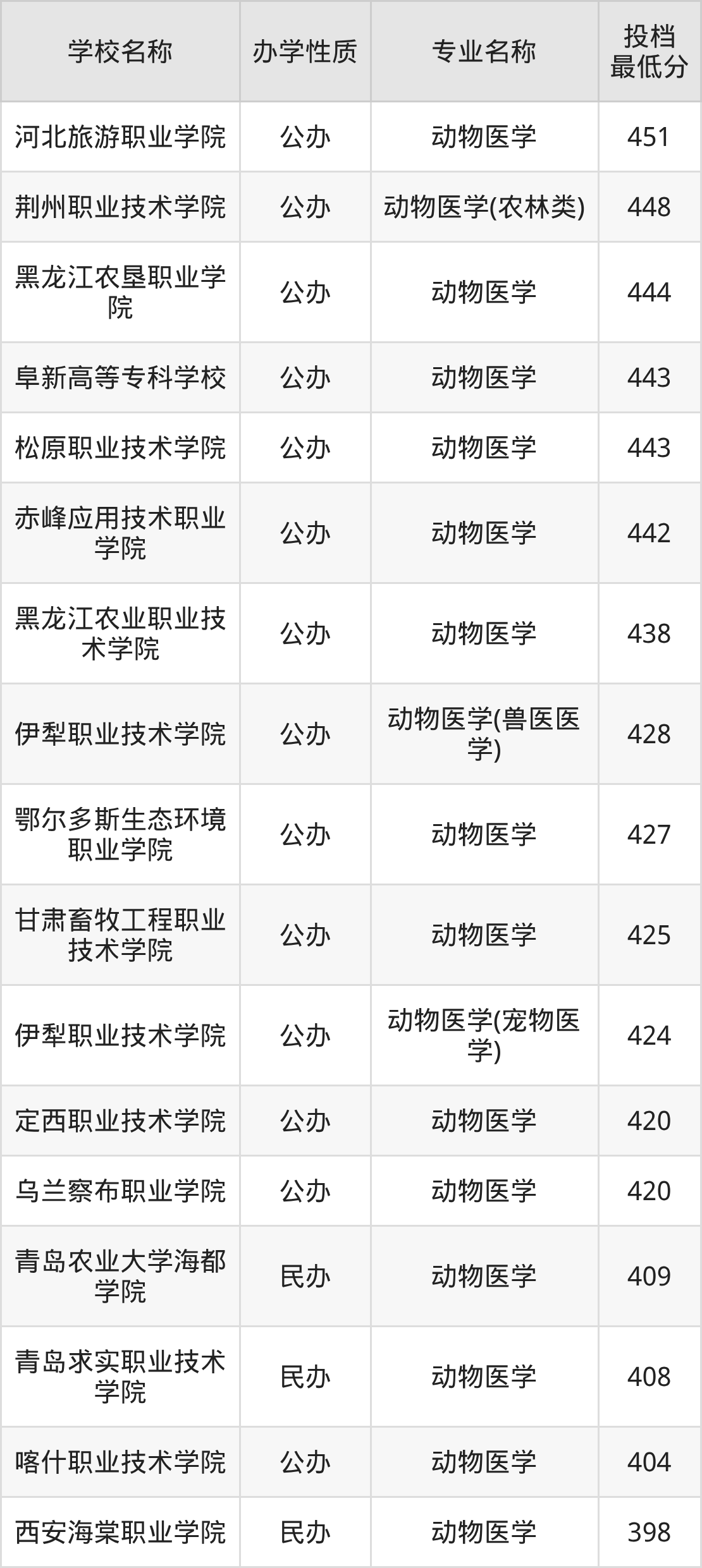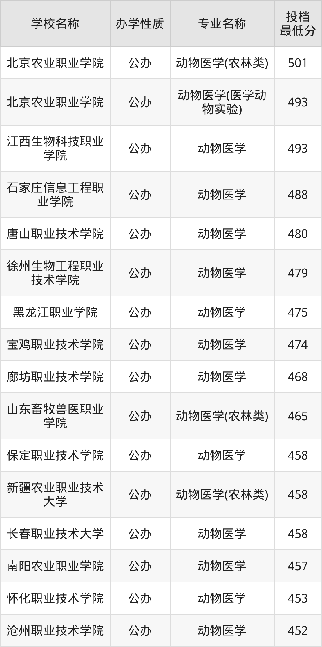 动物医学专业收分最低的公办大学是喀什职业技术学院,2025年最低分404分,超专科线204分。可见动物医学专业的招生门槛是非常高的,如果想要上一所公办专科大学的动物医学专业,至少需要过专科线204分及以上。