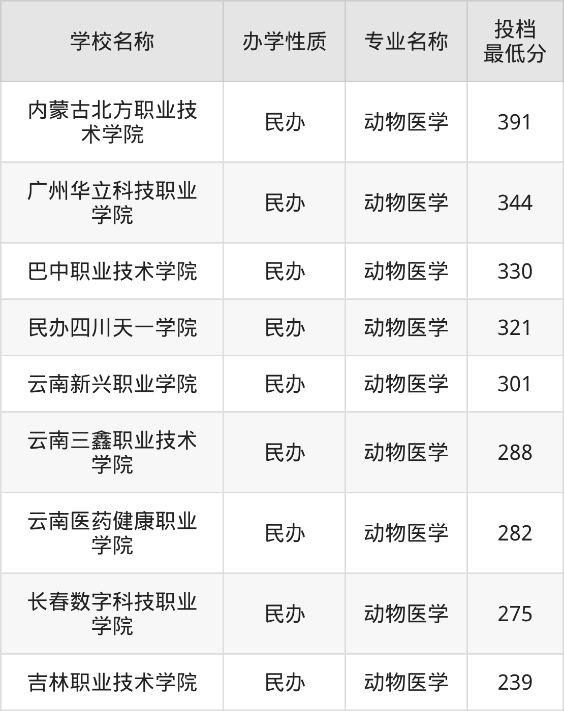 2025年动物医学专业最低录取分数线位于239分到501分之间,收分最低的大学是吉林职业技术学院。各校最低分如下。