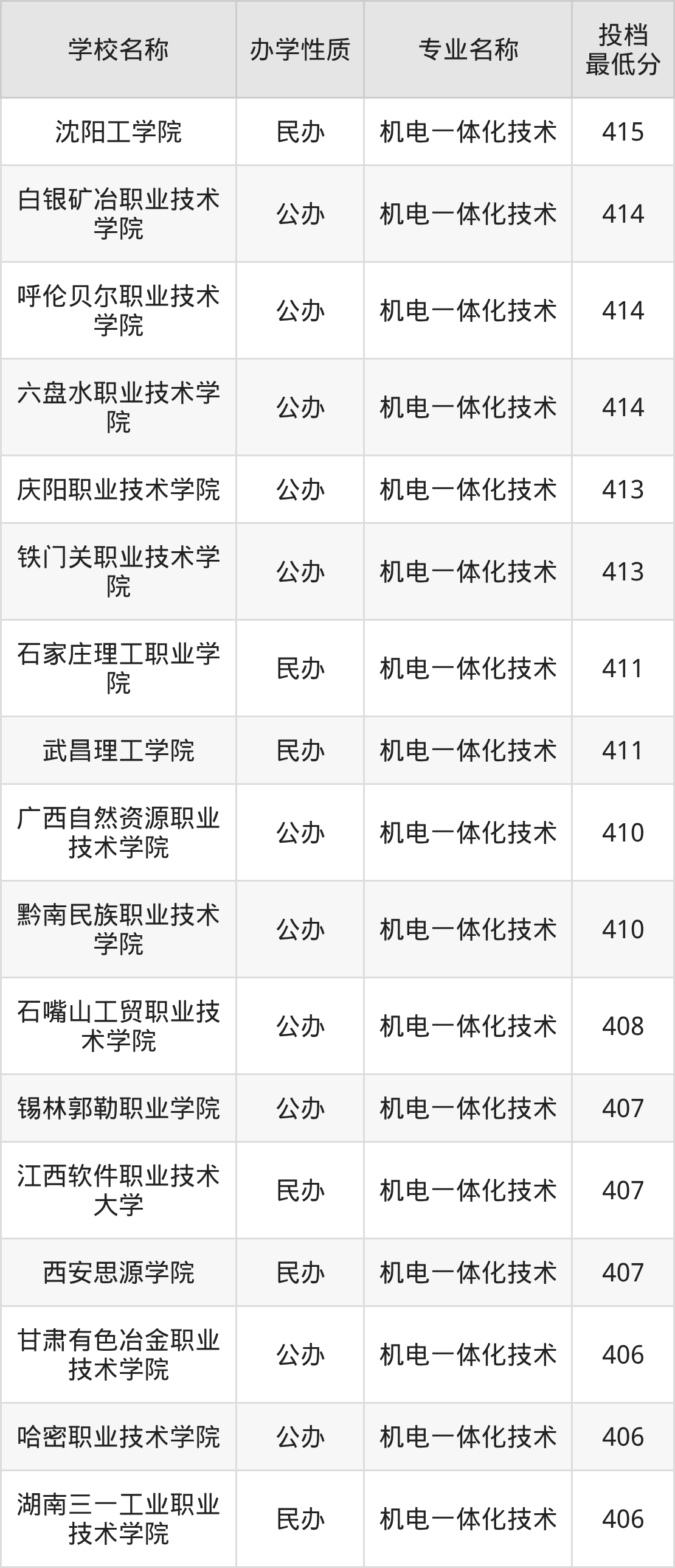 2025年机电一体化技术专业最低录取分数线是203分,超专科分数线(200分)3分。也就是说想报考机电一体化技术专业的同学,至少得超过专科线3分及以上。机电一体化技术专业最低分的大学是江阳城建职业学院,不过该校属于民办。