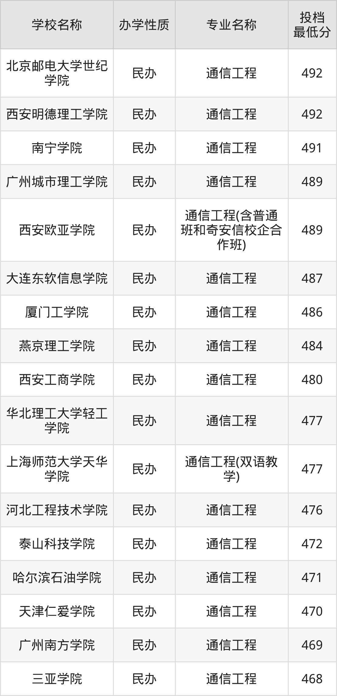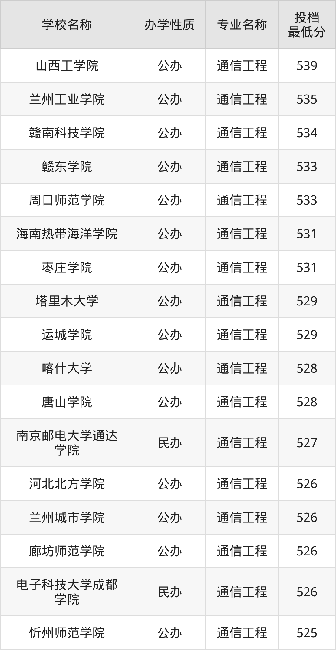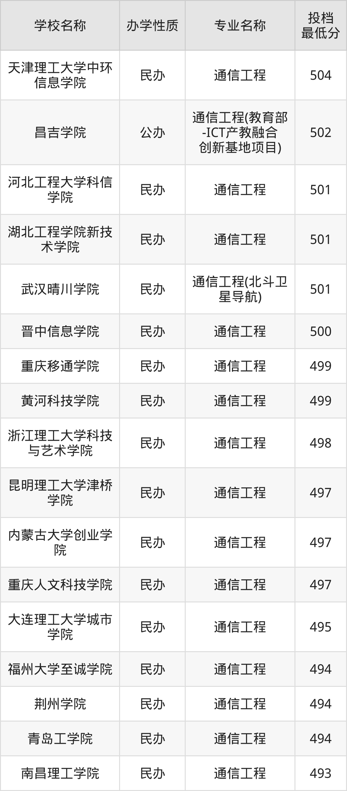 500分左右的通信工程大学:武汉晴川学院501分(北斗卫星导航)、湖北工程学院新技术学院501分、河北工程大学科信学院501分、昌吉学院502分(教育部-ICT产教融合创新基地项目)、天津理工大学中环信息学院504分等;