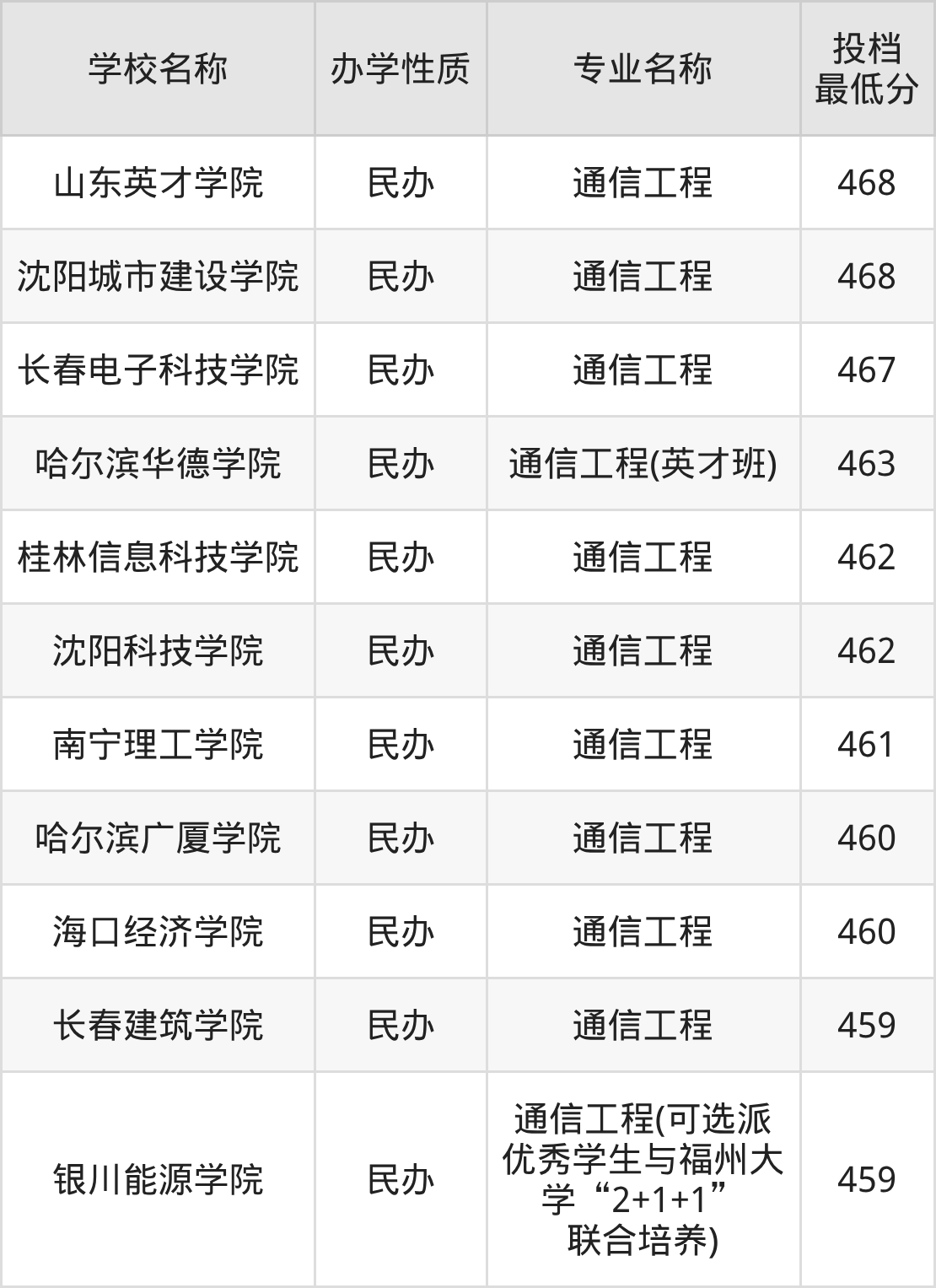 2025年通信工程专业最低录取分数线是459分,刚好在本科分数线(459分)处。也就是说想报考通信工程专业的同学,至少得达到本科线459分及以上。通信工程专业最低分的大学是银川能源学院,不过该校属于民办。