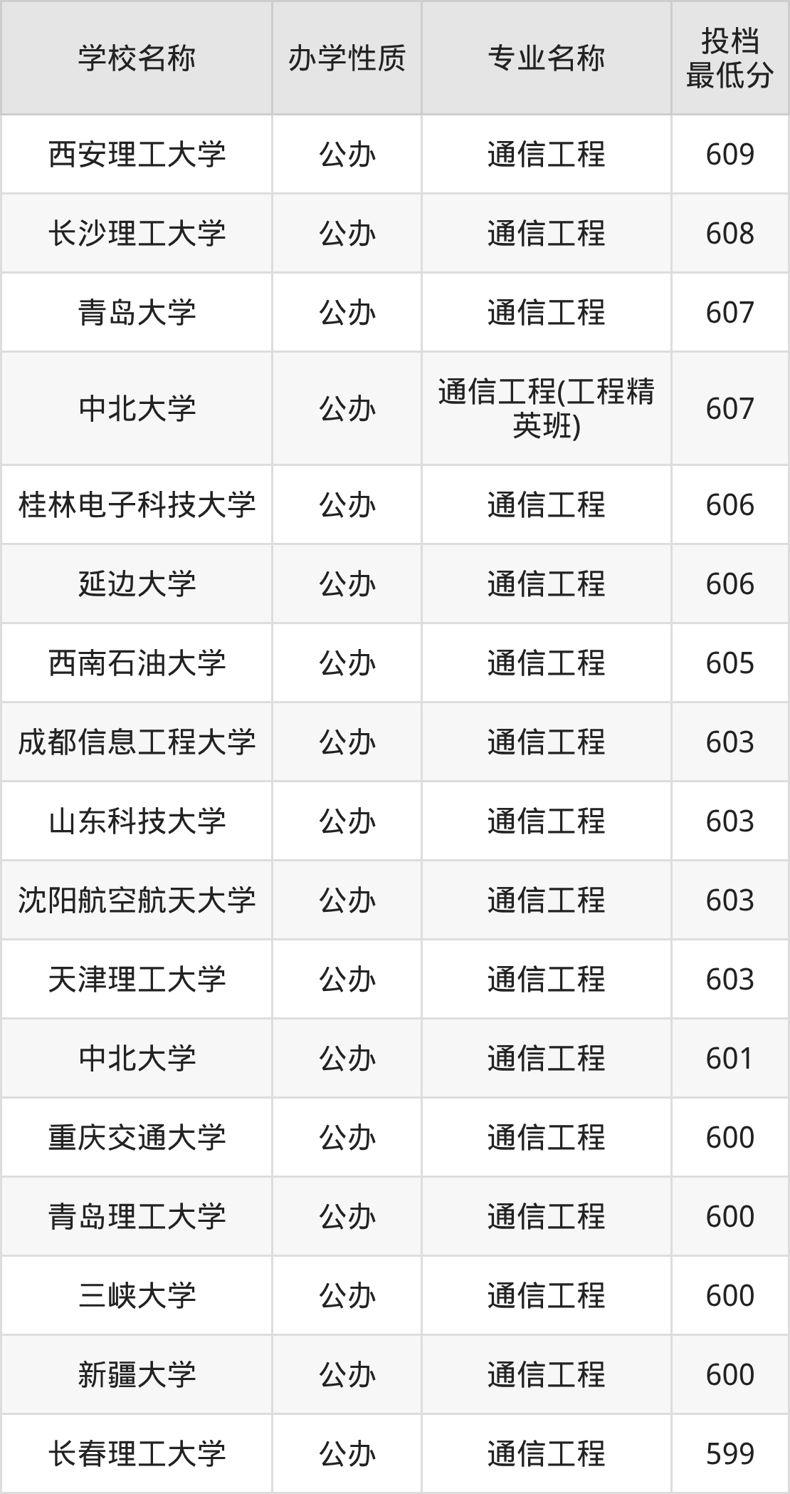 600分左右的通信工程大学:中北大学601分、天津理工大学603分、沈阳航空航天大学603分、山东科技大学603分、成都信息工程大学603分等;