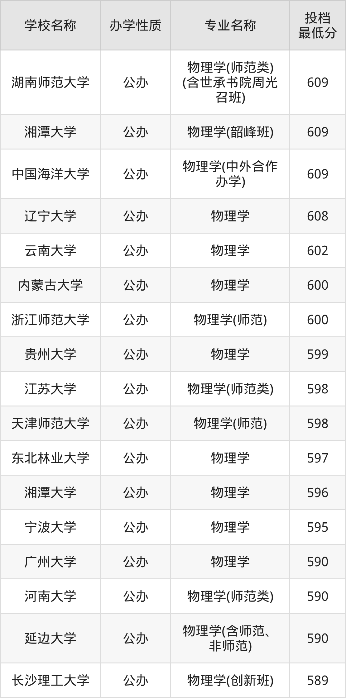 600分左右的物理学大学:云南大学602分、辽宁大学608分、中国海洋大学609分(中外合作办学)、湘潭大学609分(韶峰班)、湖南师范大学609分(师范类)(含世承书院周光召班)等;