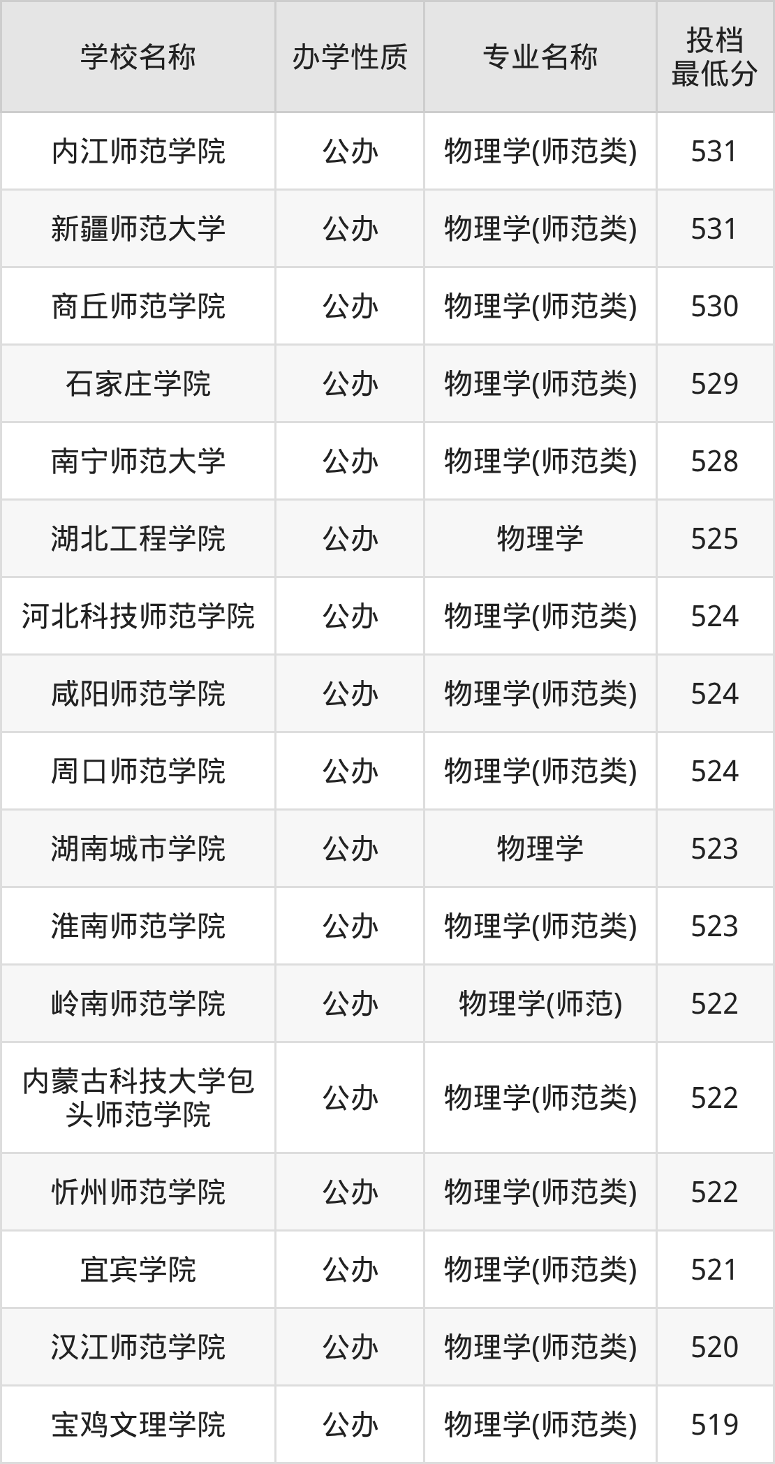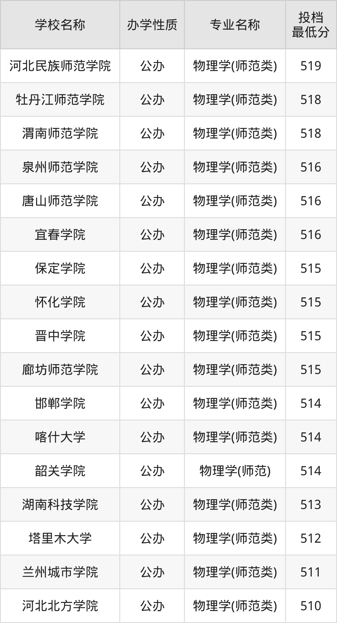 物理学专业收分最低的公办大学是新疆和田学院,2025年最低分498分,超本科线39分。可见物理学专业的招生门槛是非常高的,如果想要上一所公办本科大学的物理学专业,至少需要过本科线39分及以上。