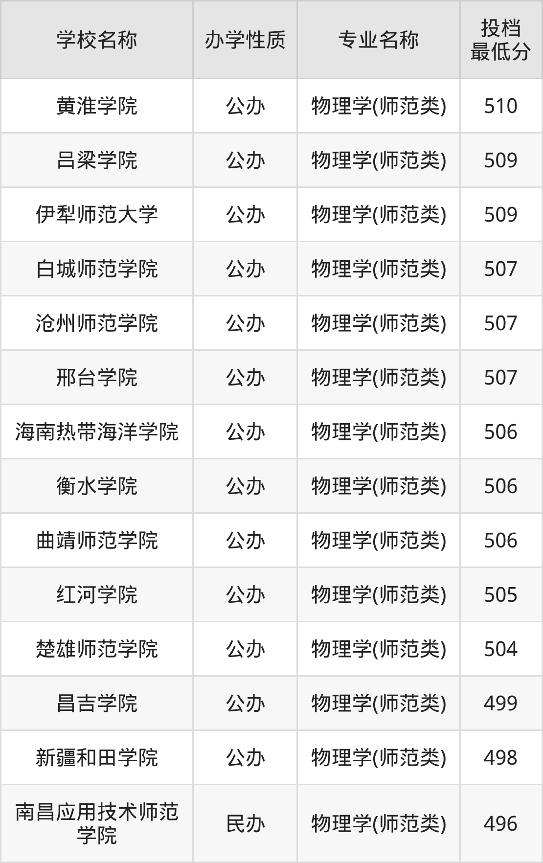 2025年物理学专业最低录取分数线是496分,超本科分数线(459分)37分。也就是说想报考物理学专业的同学,至少得超过本科线37分及以上。物理学专业最低分的大学是南昌应用技术师范学院,不过该校属于民办。