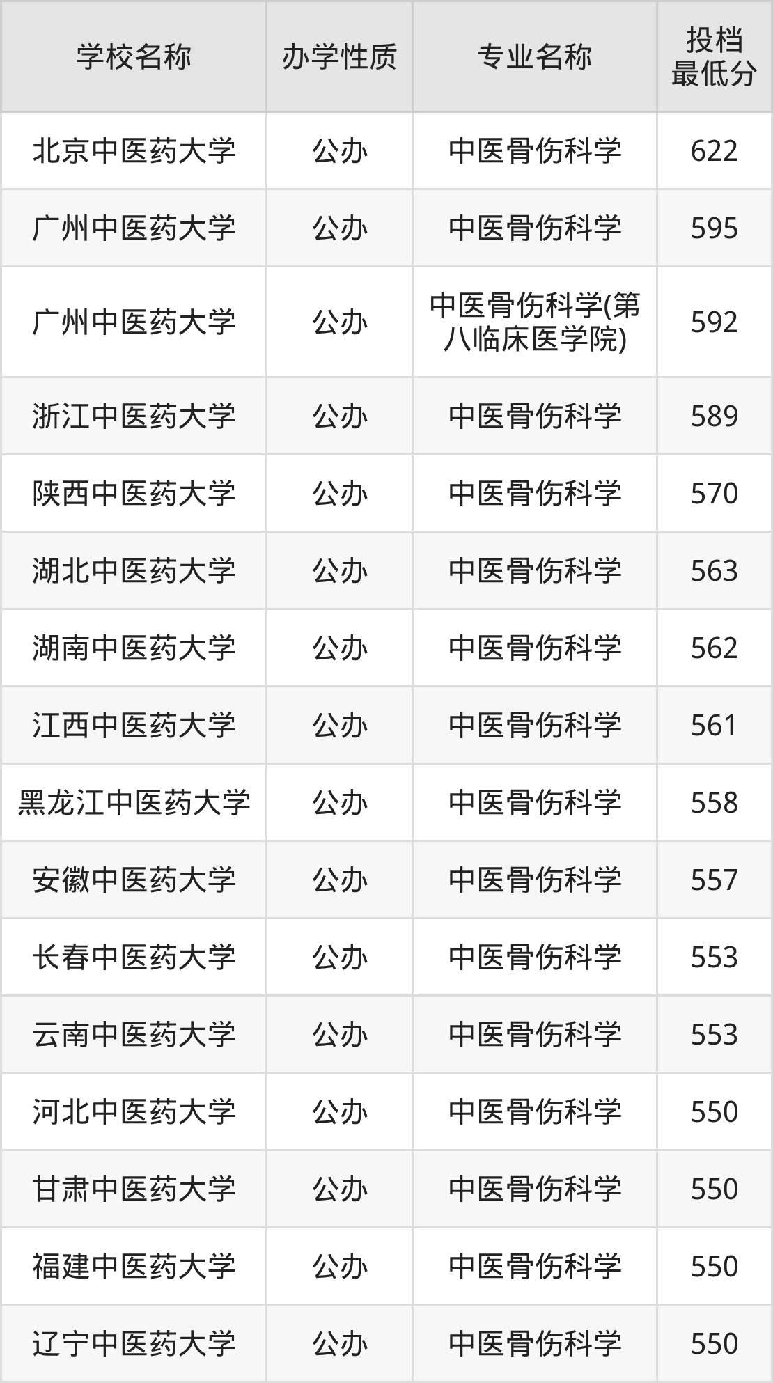 下面是2025年全国所有大学中医骨伤科学专业录取分数线一览表(按照分数线从高到低排名):