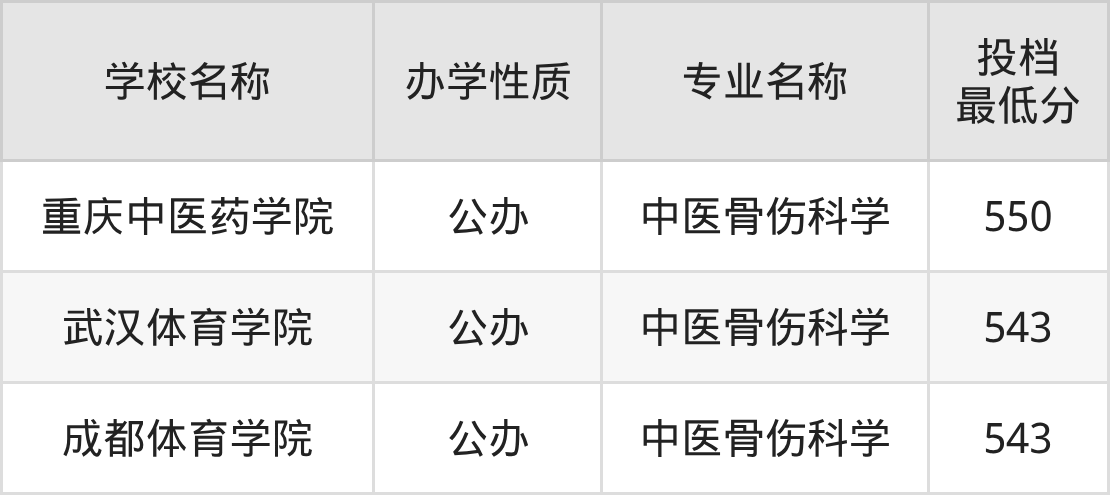 500分左右的中医骨伤科学大学:成都体育学院543分、武汉体育学院543分、重庆中医药学院550分、辽宁中医药大学550分、福建中医药大学550分等;
