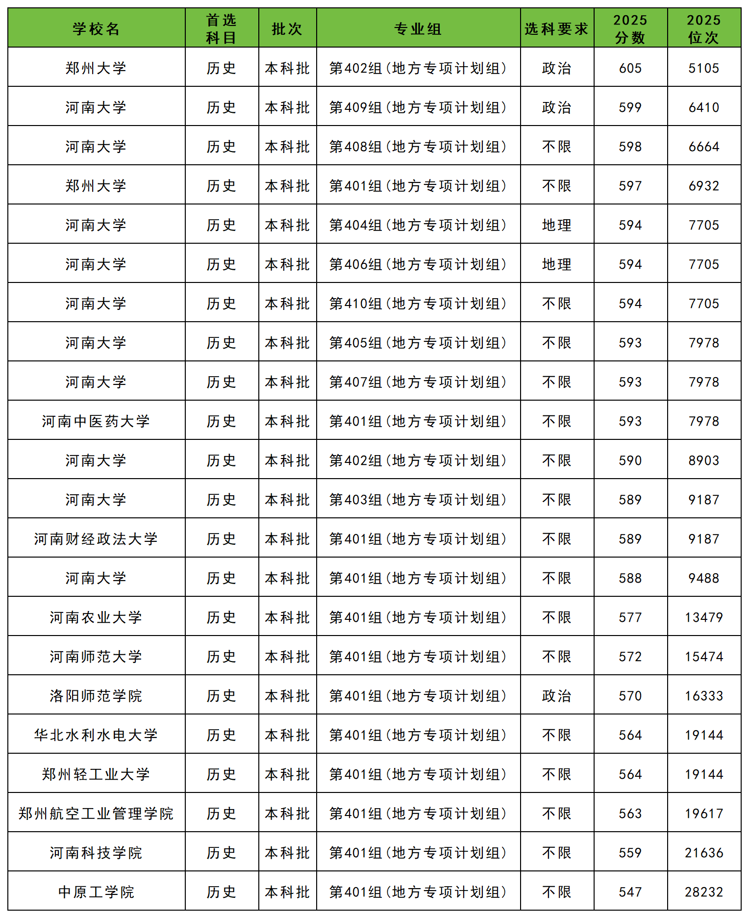 2025年河南地方专项历史类录取分数线位于547分到605分之间,各学校各专业组最低分如下。