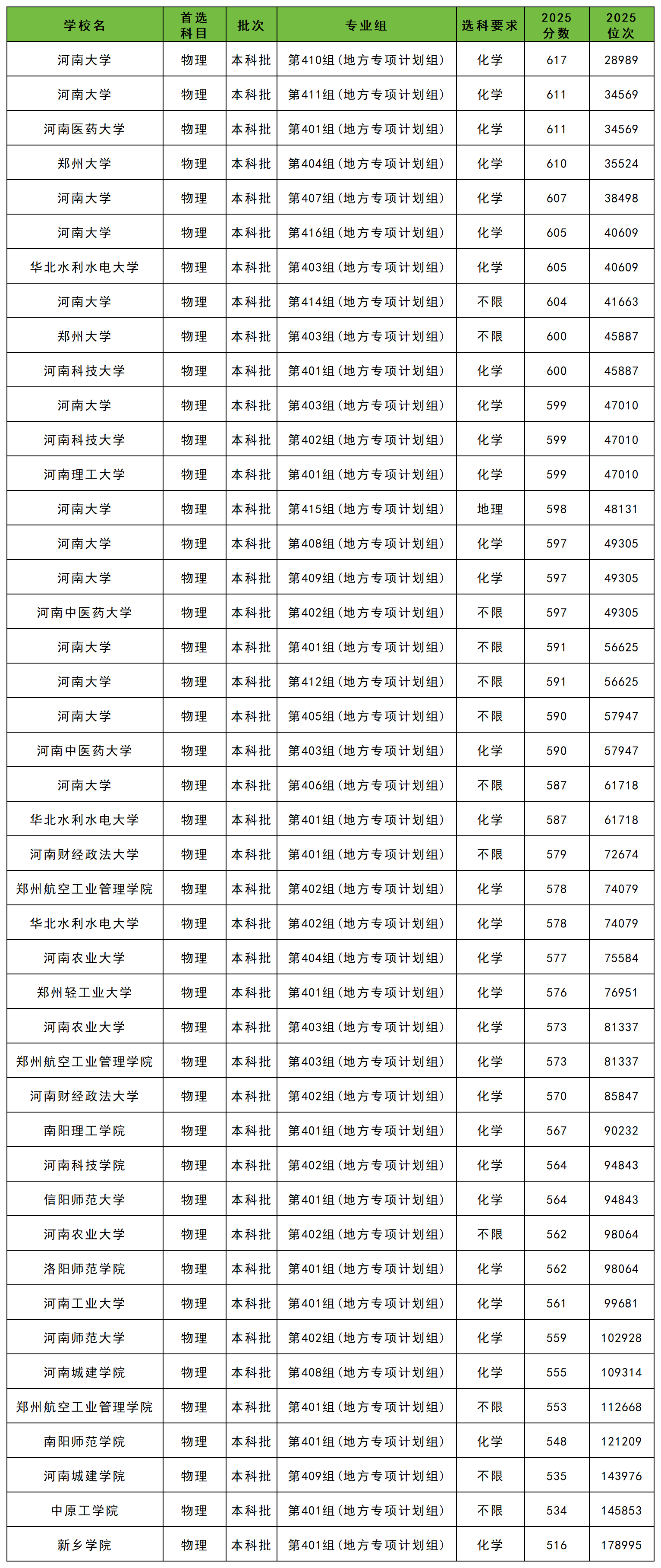 2025年河南地方专项计划大学物理类录取分数线一览表: