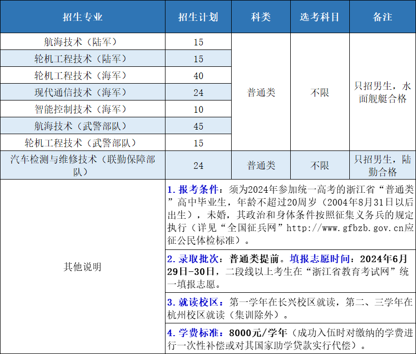 2024年浙江省专科提前批有定向培养军士、航海类等类别的招生。本期将介绍定向培养军士在浙江的招生学校。