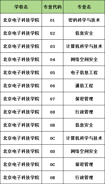 为降低志愿填报出错率,各校各专业(组)也拥有各自的代码,如北京电子科技学院专业代码为:密码科学与技术01、信息安全02、计算机科学与技术03、网络空间安全04等。