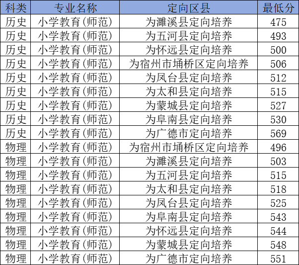 2024年定向师范生最低录取分数线为:历史类482分,定向地区为宿州市埔桥区;物理类496分,定向地区为太和县。面向不同地区就业最低分一览表: