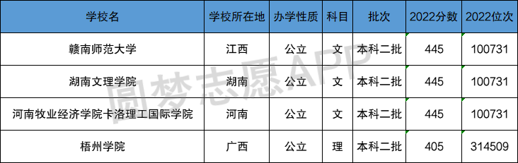 2022年在河南省的录取分数线为二本最低录取分数线的公办二本大学一共有4所。其中,理科生可选的大学是梧州学院,文科生可选择赣南师范大学、湖南文理学院、河南牧业经济学院卡洛理工国际学院等3所公办大学。