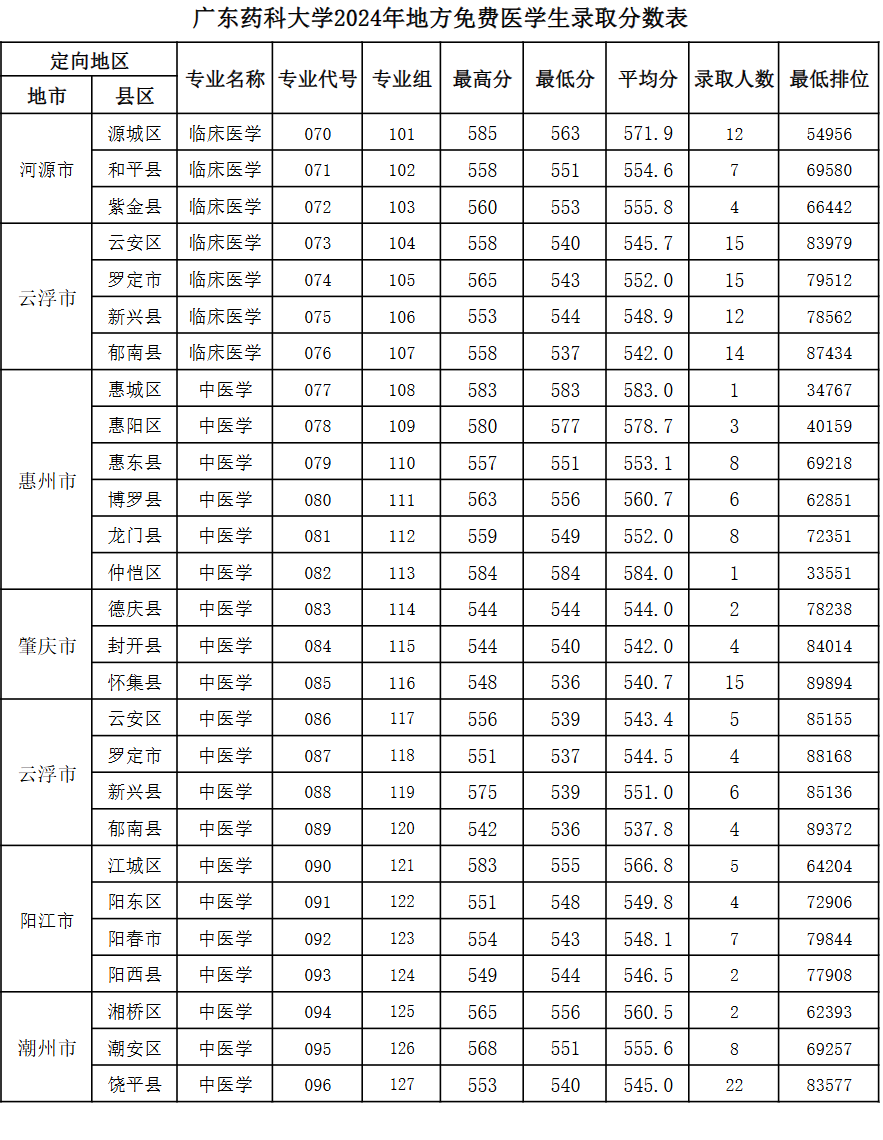 临床医学专业:2024年录取需面向梅江区、梅县区、平远县、兴宁市、大埔星、丰顺县、五华县、揭东区、揭西县就业,在肇庆市封开县就业的分数线最低,需要523分。