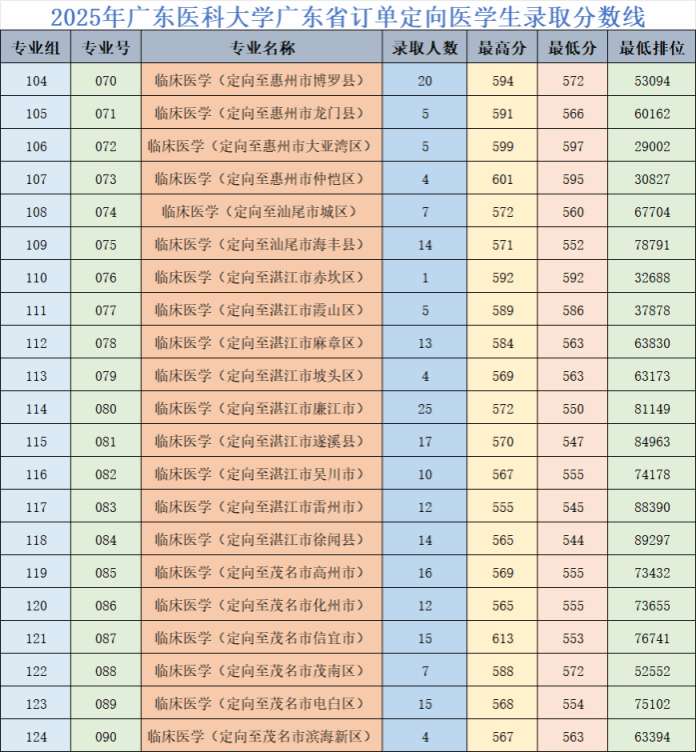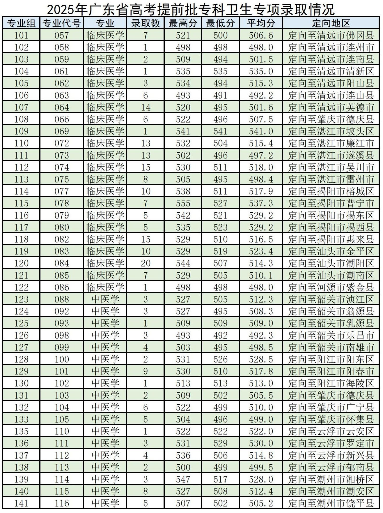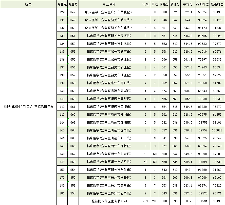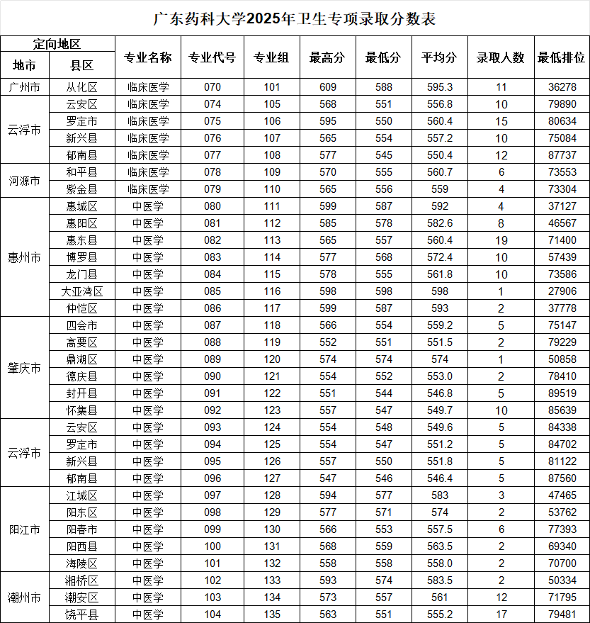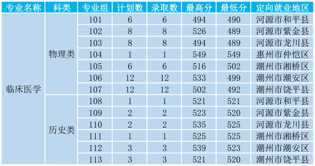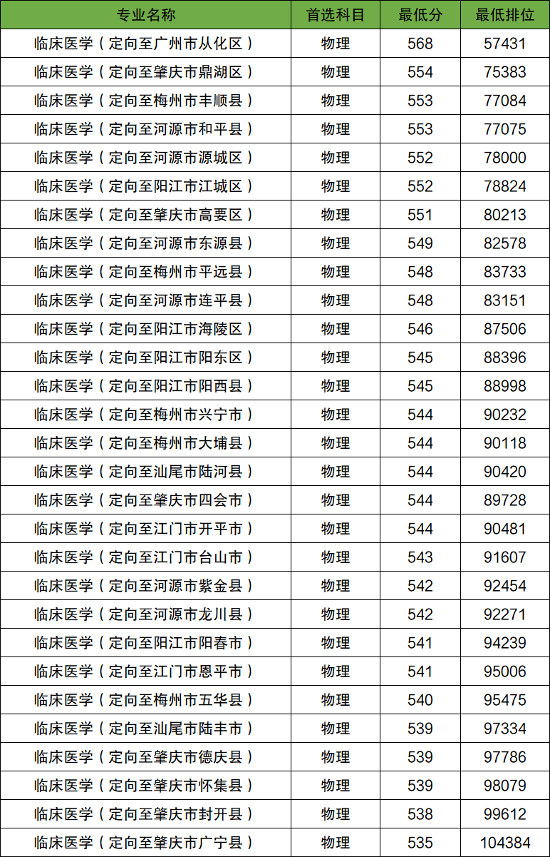 临床医学专业:2025年录取需面向广州市从化区、肇庆市鼎湖区、梅州市丰顺县、河源市和平县、河源市源城区、阳江市江城区、肇庆市高要区就业,在肇庆市广宁县就业的分数线最低,需要535分。