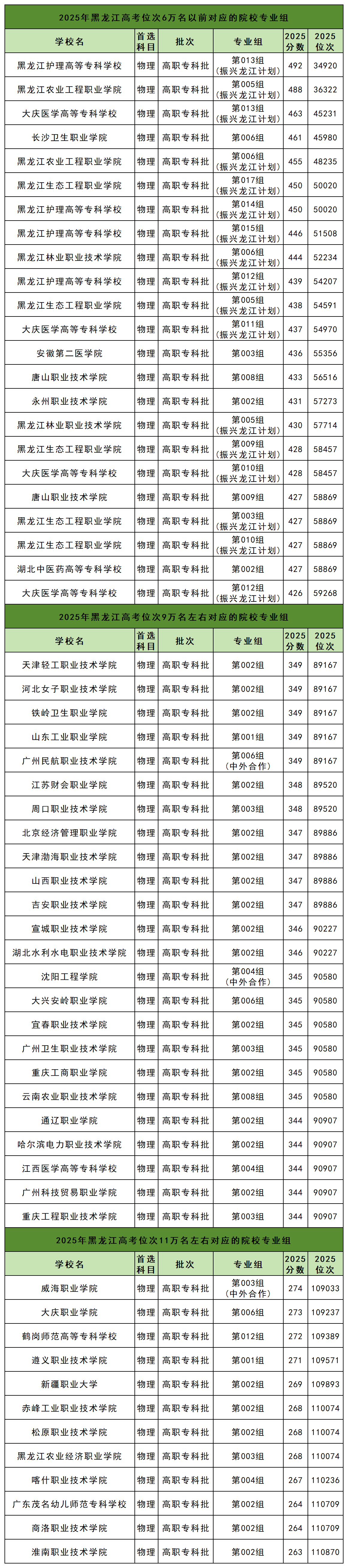物理类位次排名6万名以前对应的专科院校专业组有23个,分数线在426分到492分不等。其中分数线最高的院校专业组是黑龙江护理高等专科学校013组(振兴龙江计划),2025年最低录取位次为34920名。分数线最低的院校专业组是大庆医学高等专科学校012组(振兴龙江计划),2025年最低录取位次为59268名。