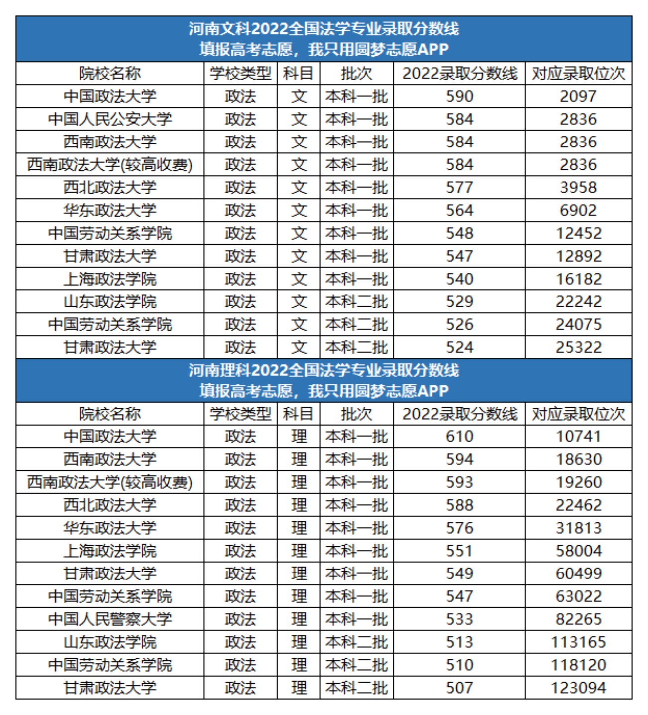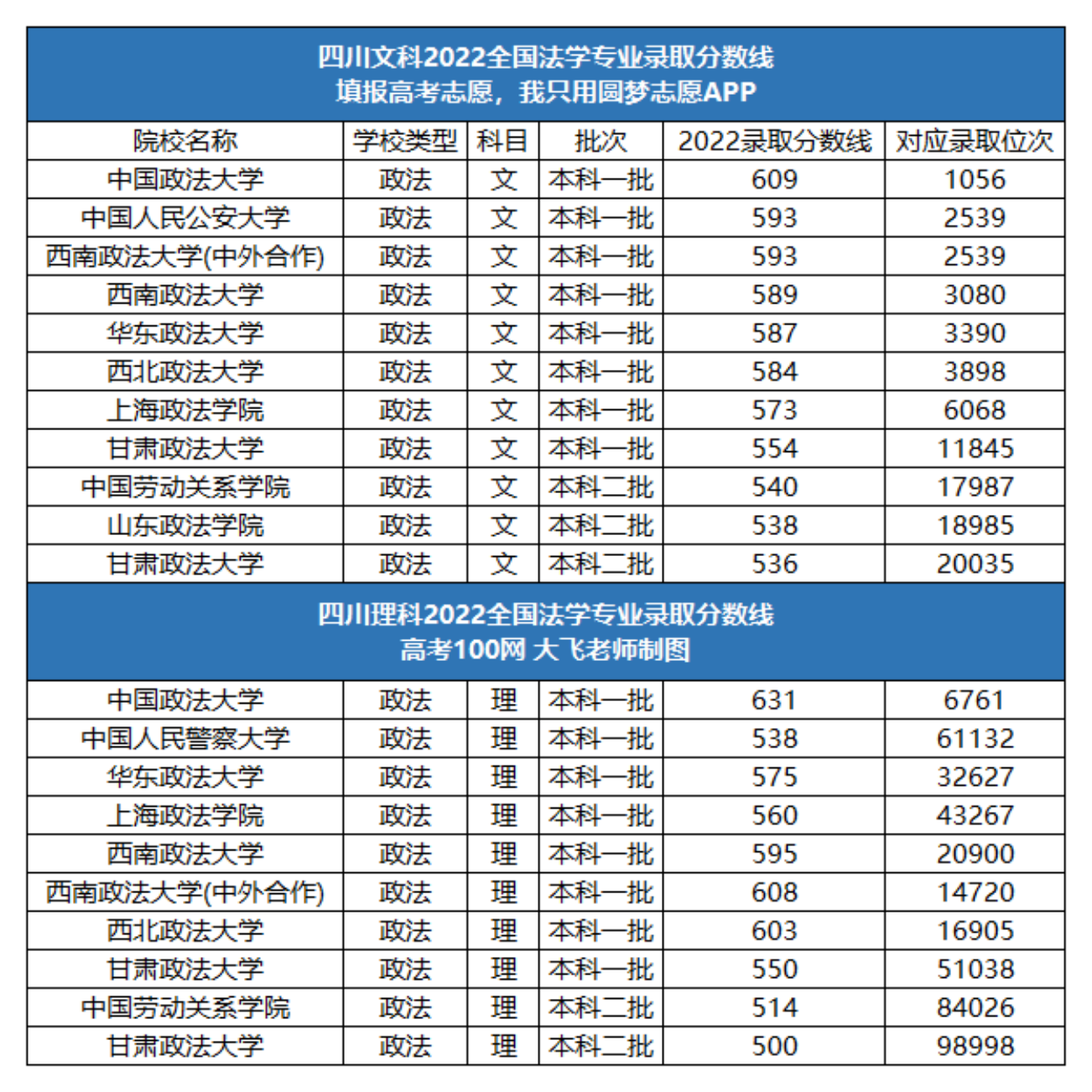 根据教育考试院公布的2022年各省份大学录取分数线数据,高考100网小编为大家整理了四川、河南两省的全国法学专业录取分数线文理科汇总,供大家参考。