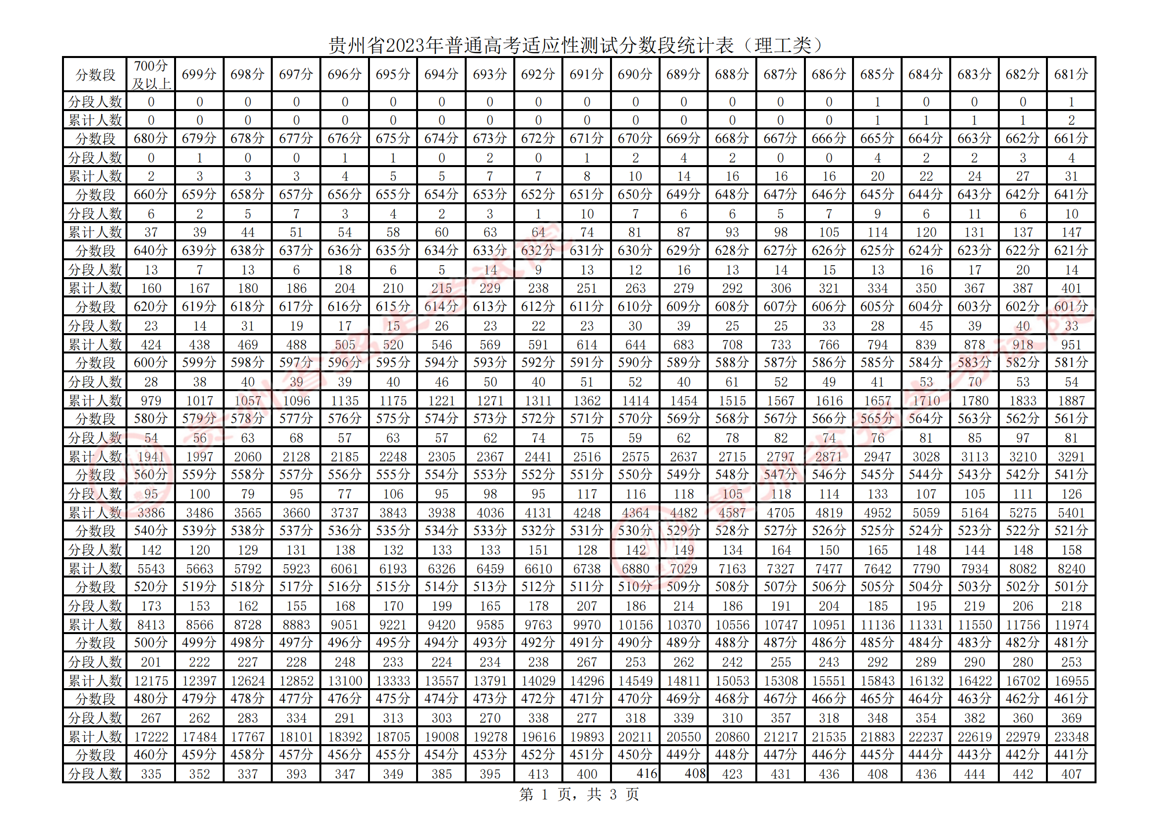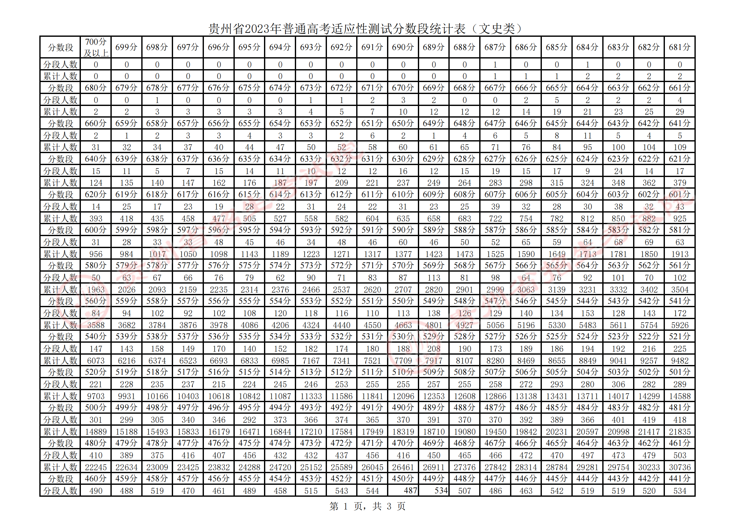 无论是模考还是高考,分数线和一分一段表都是非常重要的参考,同时也是考生衡量自己在本省成绩排名的有效方式,2023年贵州高考适应性测试的分数段统计表现已由教考院公布,大家可以在下方进行查看。