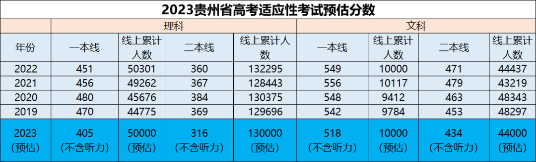 由于2023年贵州省教考院官方没有正式公布适应性测试的分数线情况,我们结合历年来贵州高考的分数线划线情况以及上线考生人数的数据,为大家整理了2023年贵州适应性测试的分数线,仅供大家参考。