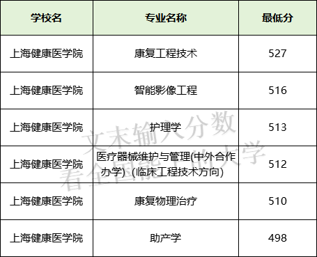 2024年上海健康医学院本科专业最低498分,收分最低的三个专业是助产学(498分)、康复物理治疗(510分)、医疗器械维护与管理(中外合作办学)(临床工程技术方向)(512分)。