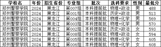 2024年黑龙江警校院校录取分数线最低分:郑州警察学院488分、黑龙江公安警官职业学院490分。