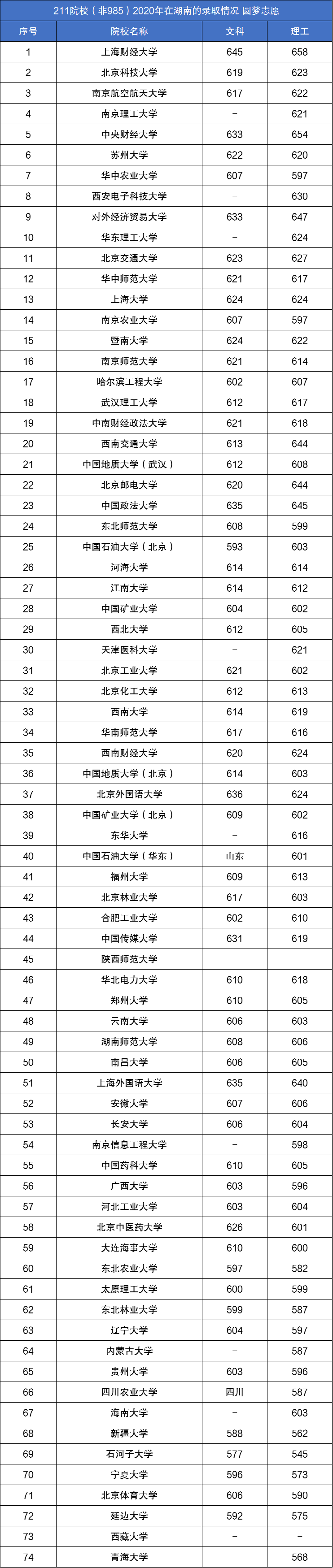根据湖南省2020年普通高校招生本科一批平行一志愿投档分数线显示,74所未入选“985工程”但入选了“211工程”的院校中,2020年在湖南的录取分数具体为: