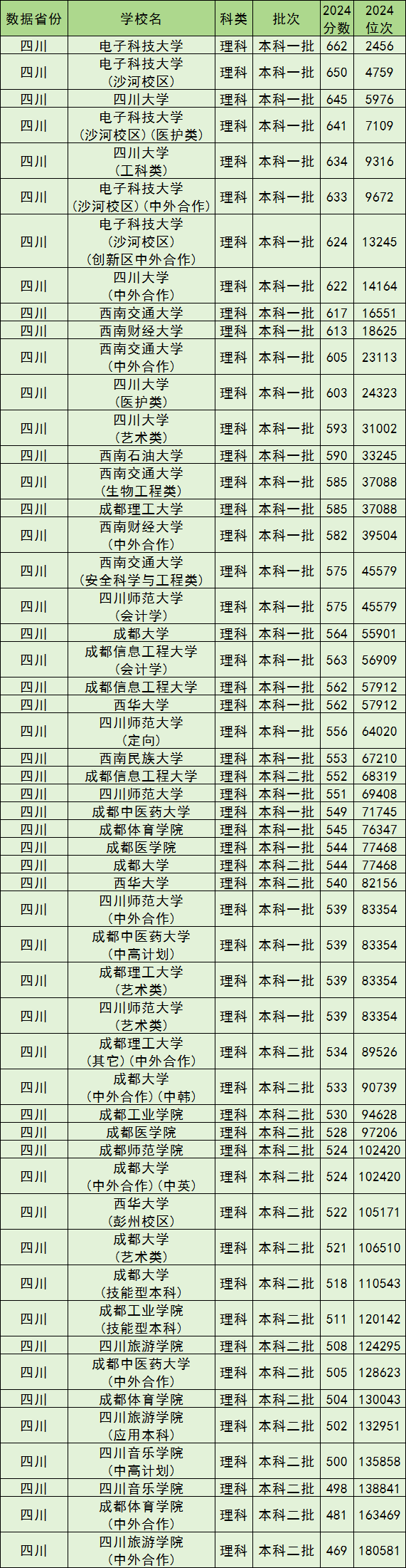 下面是2024年成都市公办本科院校分数线排名理科一览表: